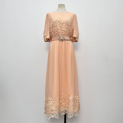 Elegant Lace Patchwork Chiffon Midi Dress Waist Slimming Round Neck Temperament Dress