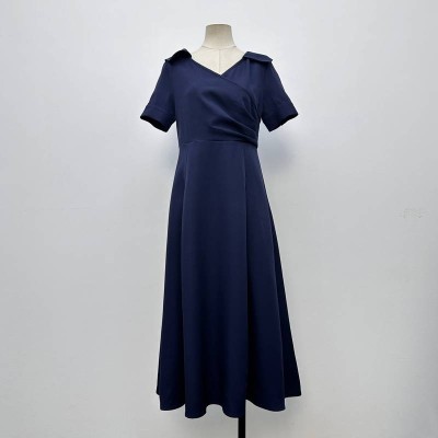 Navy V-neck Waist-cinched Midi Dress Elegant Short-sleeve Dress