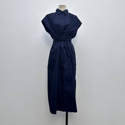 Navy Blue Lapel Waist-Tie Midi Shirt Dress
