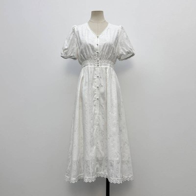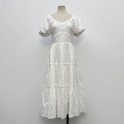 French White Embroidered Puff Sleeve Midi Dress Gentle Style Waist Slimming Temperament Dress