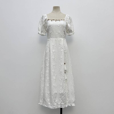 French Square Neck Embroidered White Maxi Dress, Temperament Slim Puff Sleeve Dress