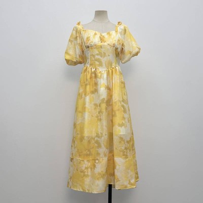 Yellow Tie-dye Square Neck Puff Sleeve Midi Chiffon Dress