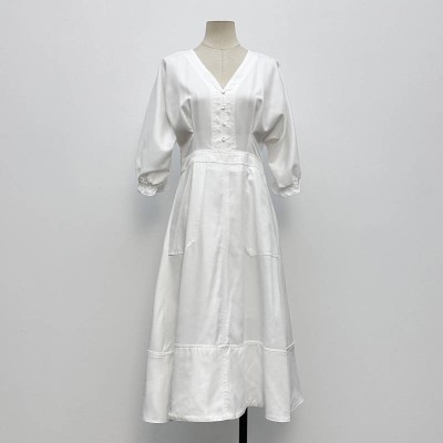 White V-neck Button Waist Shirt Dress Seven-quarter Sleeve Mid-length Dress
