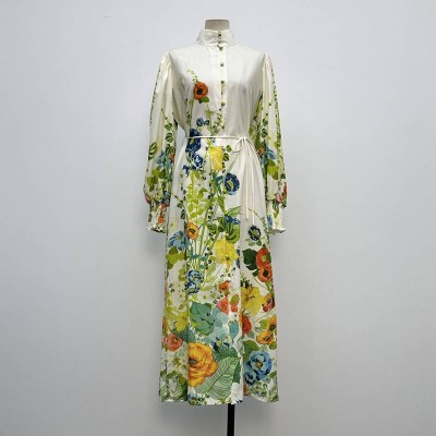 Stand Collar Long Sleeve Floral Print Waist Cinched Midi Shirt Dress