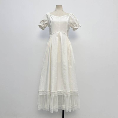 Elegant Square Neck Puff Sleeve Lace Patchwork Off-White Midi Dress