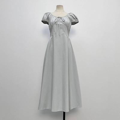Simple Gray Square Neck Puff Sleeve Waist-cinching Midi Dress Elegant Slim French Dress