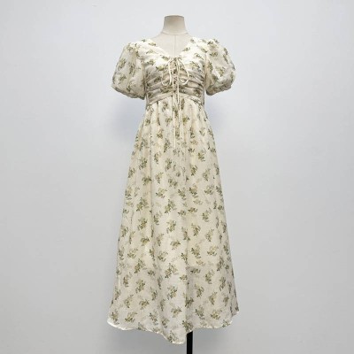 French V-neck Puff Sleeve Floral Chiffon Midi Dress Waist Slimming Temperament Dress