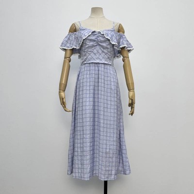 Blue and White Plaid Off-Shoulder Slip Midi Dress French Style Waist Slimming Dress