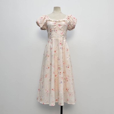 Gentle Floral Square Neck Puff Sleeve Waisted Midi Dress