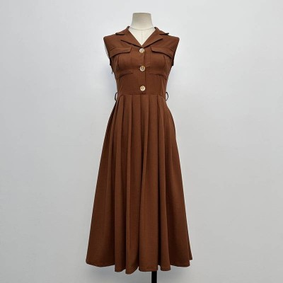 Vintage Lapel Sleeveless Waist Slimming Pleated Midi Dress