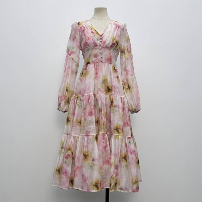 Floral Chiffon V-neck Long Sleeve Midi Dress, Waist Slimming Temperament Dress