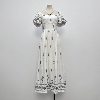 Vintage Embroidered Puff Sleeve Midi Dress Waist Slimming Square Neck Vacation Dress