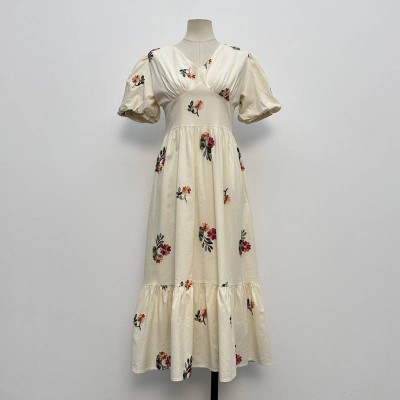 Vintage Embroidered V-neck Puff Sleeve Waist-cinched Midi Dress