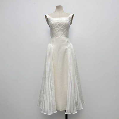 French Elegant White Square Neck Sling Midi Dress Waist-Tucked Pleated Panel Temperament Dress