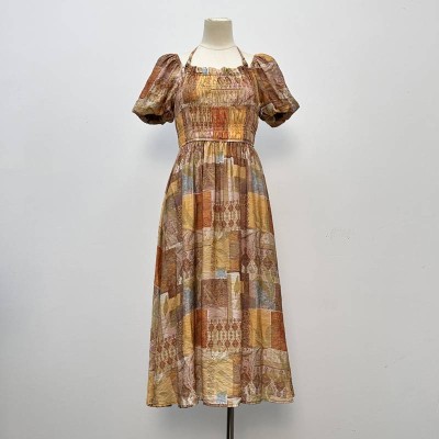 Square Neck Halter Puff Sleeve Mid-length Printed Dress