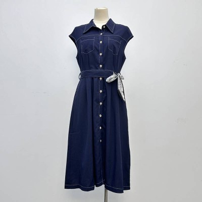 Navy Blue Shirt Collar Sleeveless Waist-Tied Midi Dress Elegant Commuter Dress