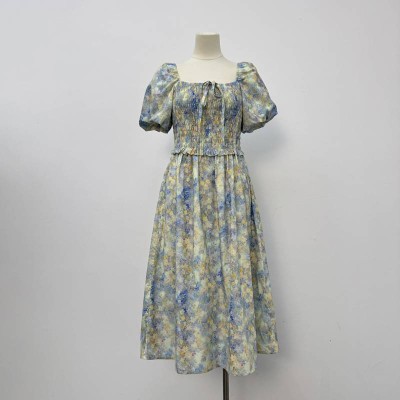 Square Neck Puff Sleeve Floral Waist-cinching Midi Dress Vintage Oil Painting Style Slim Dress