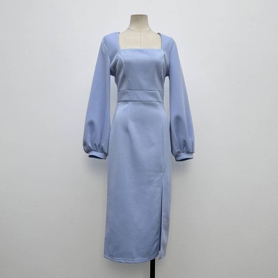 Square Neck Puff Sleeve Waist Slit Midi Dress Elegant Commuter Slim Fit Dress