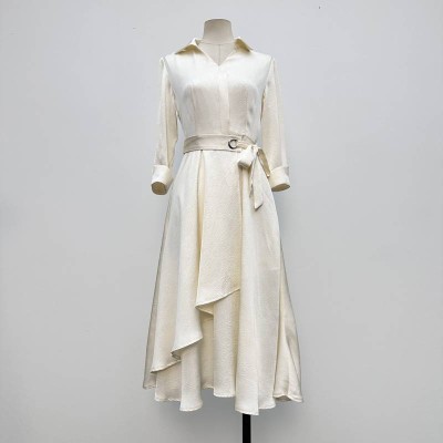 Elegant Satin Shirt Collar Midi Dress Waist Slimming Irregular Hem Dress