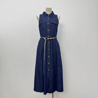 Vintage Sleeveless Shirt Collar Denim Dress Waist-tied Midi Dress