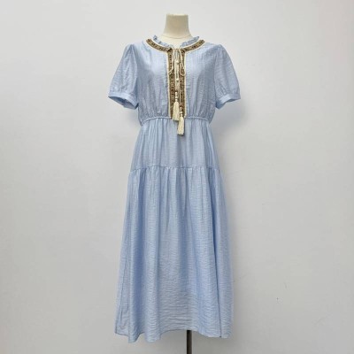 Light Blue Ethnic Style Tie Waist Midi Dress