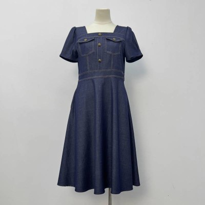 Square Neck Short Sleeve Denim Midi Dress Retro Waist Slimming Dress