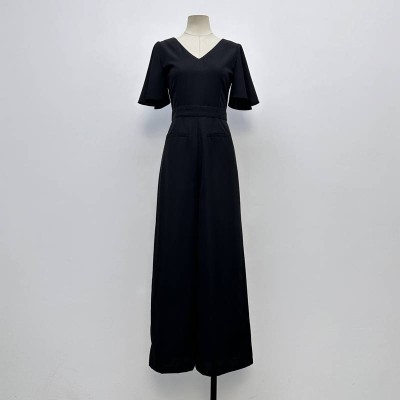 Black V-neck Short Sleeve Waist-cinched Wide-leg Jumpsuit Elegant Commuter Slim One-piece Pants