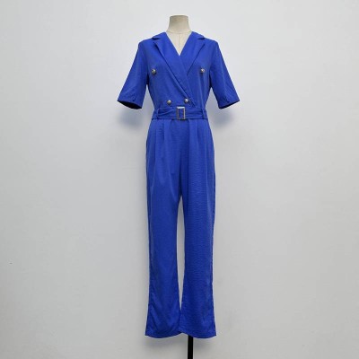 Elegant Royal Blue Suit Collar Short-sleeve Jumpsuit Waist Slimming Wide-leg One-piece Pants