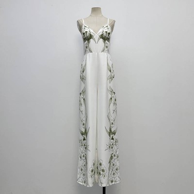 V-neck Sling Wide-leg Jumpsuit with Retro Flower & Bird Print, Sleeveless High Waist Slimming Elegant Jumpsuit