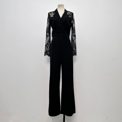 Black Lace Sleeve Lapel Waist Cinched Wide-leg Jumpsuit