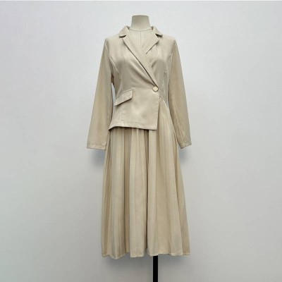 Elegant Lapel Pleated Midi Skirt Set Commute Style Fake Two-Piece Skirt Suit