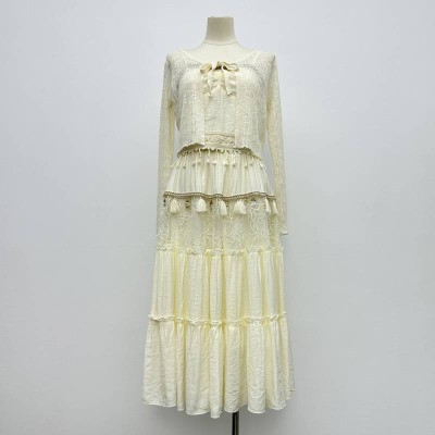Gentle Style Lace Tassel Knitted Cardigan + Slip Long Dress Two-piece Set Elegant Off-white Suit Dress