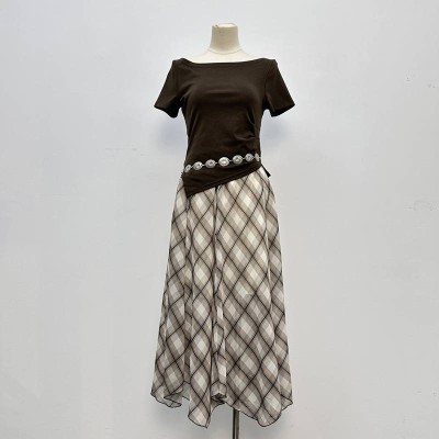 Vintage Brown Off-shoulder Short-sleeve Top & Plaid Irregular Midi Skirt Set