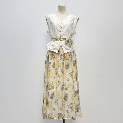Artistic Style Sleeveless Waist-cinching Top + Printed Maxi Skirt Set