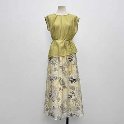 Elegant Green Sleeveless Waist-cinching Top + Printed Midi Skirt Two-piece Set