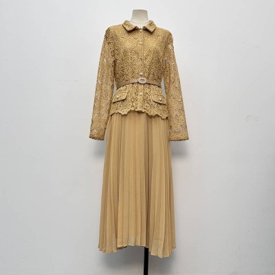 Elegant Waist-cinching Lace Top & Pleated Skirt Set Mid-length Two-piece Outfit