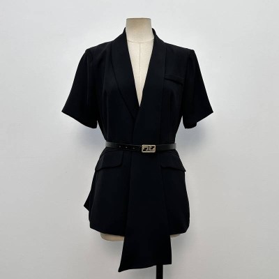 Black Short-sleeved Waist-cinched Blazer Temperament Commuter Belted Suit Top
