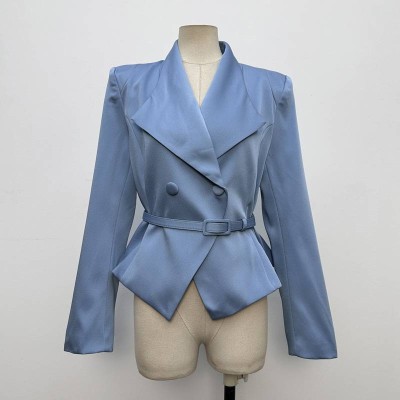 Elegant Haze Blue Waist-tied Blazer Vintage Lapel Slim-fit Suit Jacket