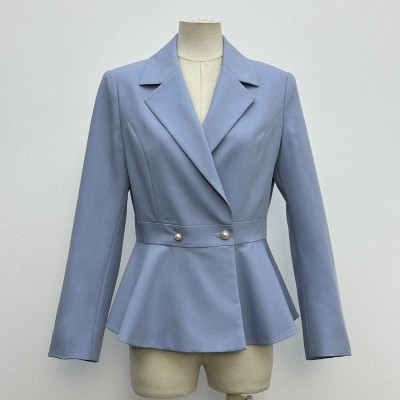 Light Blue Waist-Tucked Ruffled Blazer, Elegant Commuting Slim Fit Suit Jacket