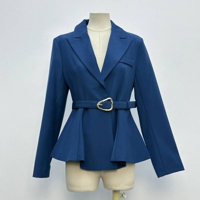 Elegant Waist Cinched Ruffled Blue Blazer Commute Style Slim Fit Blazer Top