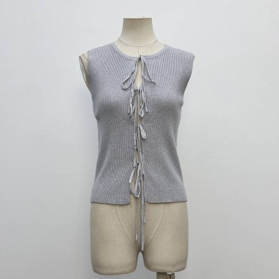 Gray Lace-up Knit Sleeveless Vest Slim Fit Round Neck Open Front Top