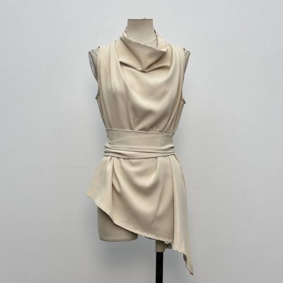 High-end Satin Cowl Neck Sleeveless Waist-cinched Top Irregular Hem Elegant Commute Top