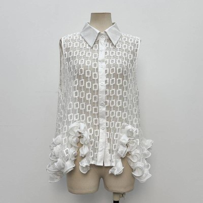 French V-neck Hollow Embroidery Waist Ruffled Blouse