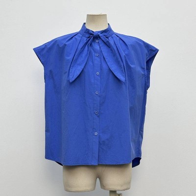 Blue Tie-neck Stand Collar Sleeveless Shirt Loose Casual Blouse