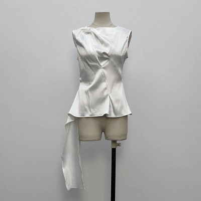 Minimalist V-neck Sleeveless Waist-cinching Top Elegant Commute Irregular Hem White Top