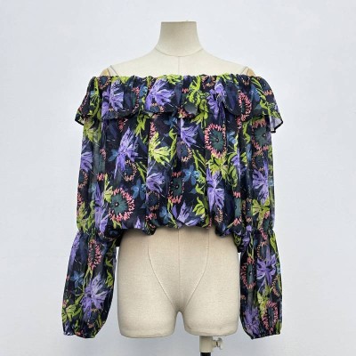 Vintage Floral Off-the-Shoulder Chiffon Top Long Sleeve Short Blouse