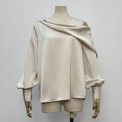 Satin Off-the-Shoulder Long Sleeve Top, Elegant Draped Neck Loose Fit Women's Blouse