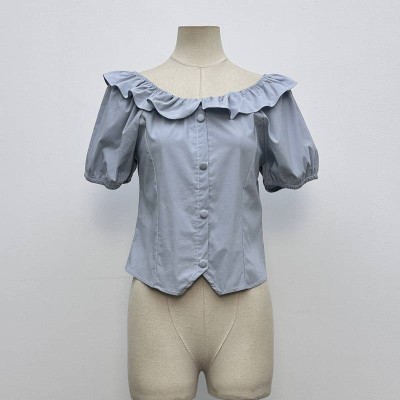 Gray Blue Ruffle Off-the-Shoulder Short Sleeve Waist-Tight Slim Top