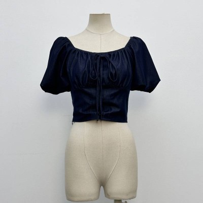 Square Neck Puff Sleeve Lace-up Waist Cropped Denim Top Off-the-Shoulder Retro Women's Top