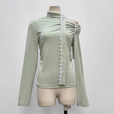 Design Sense Half Turtleneck Off-Shoulder Long Sleeve Top Lace Splicing Unique Base Shirt